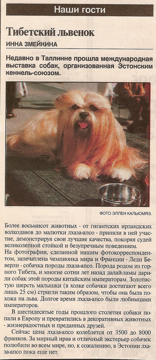 La fille de Pandora et Darwyn. Un caractère fabuleux, d’une grande gentillesse. Elle a toujours été très proche de PANDORA. Elles partageaient une étroite complicité. BEVERLY a fait beaucoup d’expos, jusqu’en Finlande et en Estonie : 18 CACIBS sous 16 juges différents. Elle est championne de France et meilleure femelle Lhassa apso de l’année 1998. Elle est également Championne Internationale.